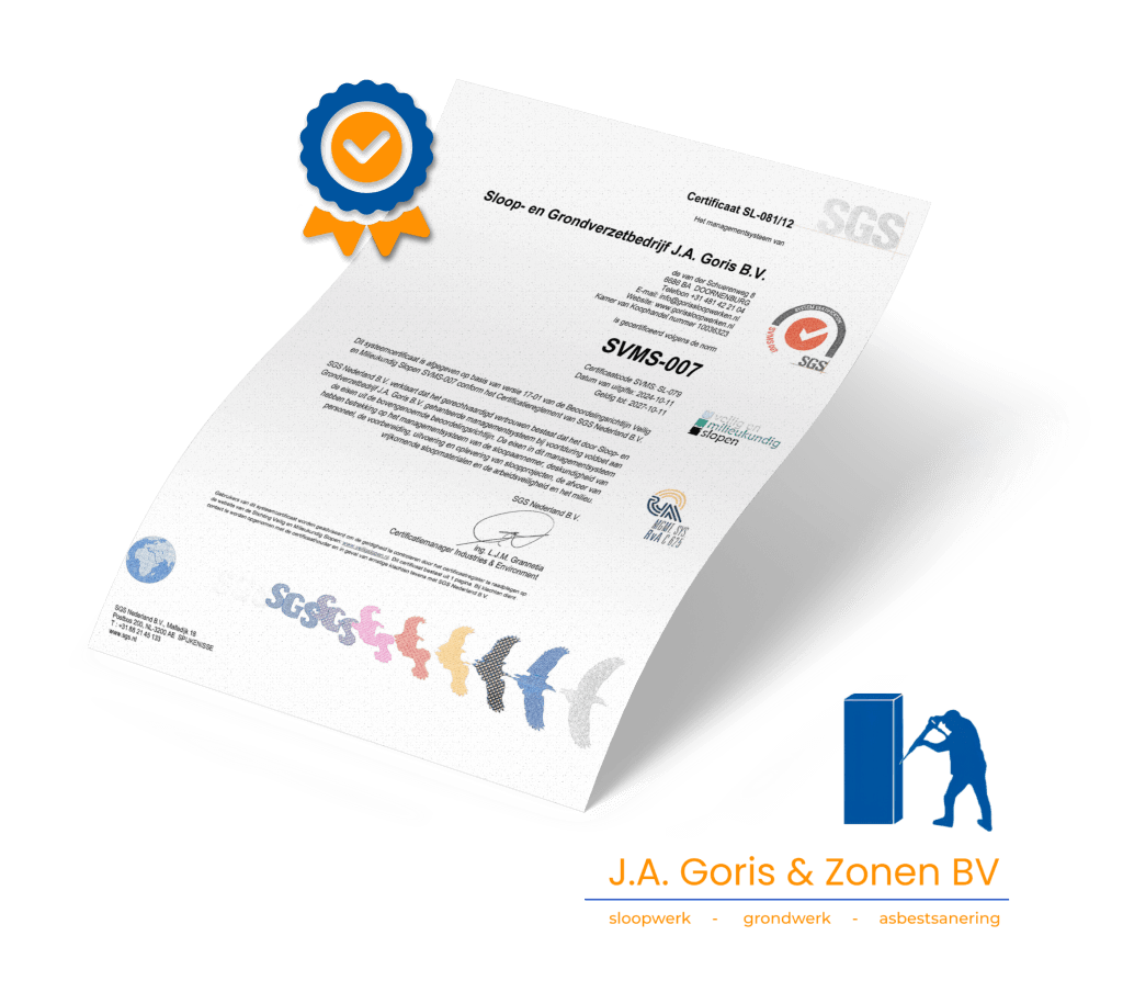 Om ieder sloopwerk goed te kunnen uitvoeren, is Goris Sloopwerken in het bezit van de juiste certificaten om veilig en milieukundig te kunnen slopen. Zo zijn wij bijvoorbeeld in het bezit van het BRL SVMS-007 certificaat, het ISO9001 certificaat en uiteraard het VCA** certificaat.